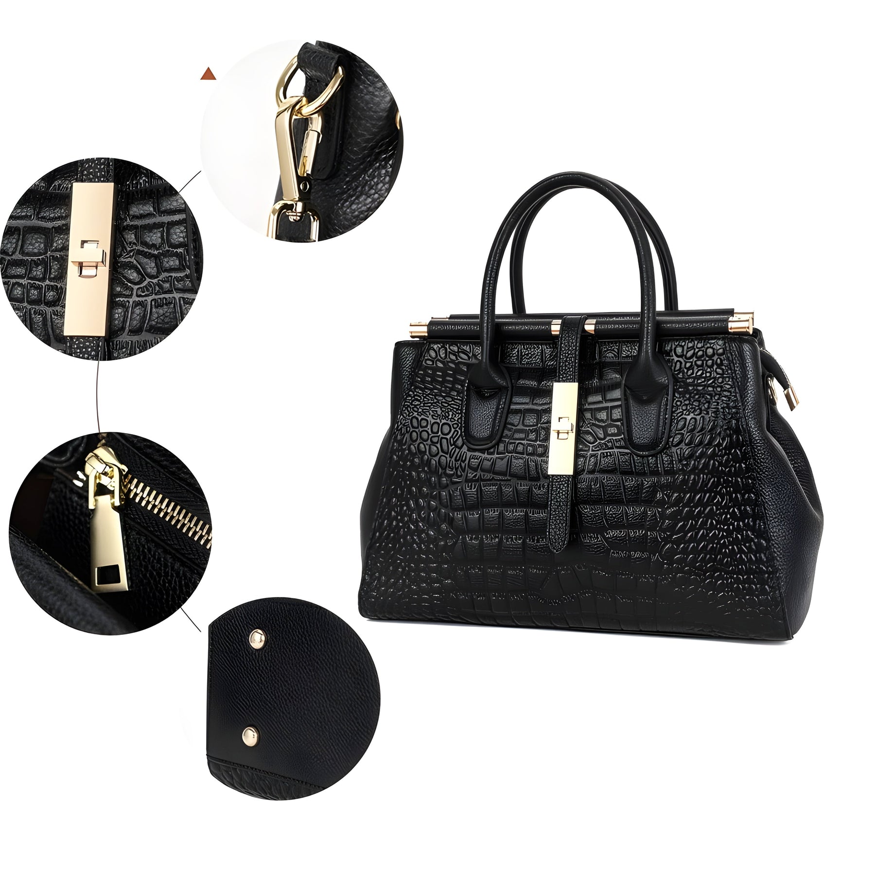 Eleganz trifft auf Raffinesse in dieser exquisit gefertigten Handtasche, die ein luxuriöses geprägtes Alligator-Muster aus hochwertigem Rindsleder aufweist. Das strukturierte Design ist sowohl modern als auch zeitlos, während der vergoldete magnetische Druckverschluss einen kräftigen Kontrast zur eleganten schwarzen Oberfläche bietet und ihren schicken Reiz verstärkt.