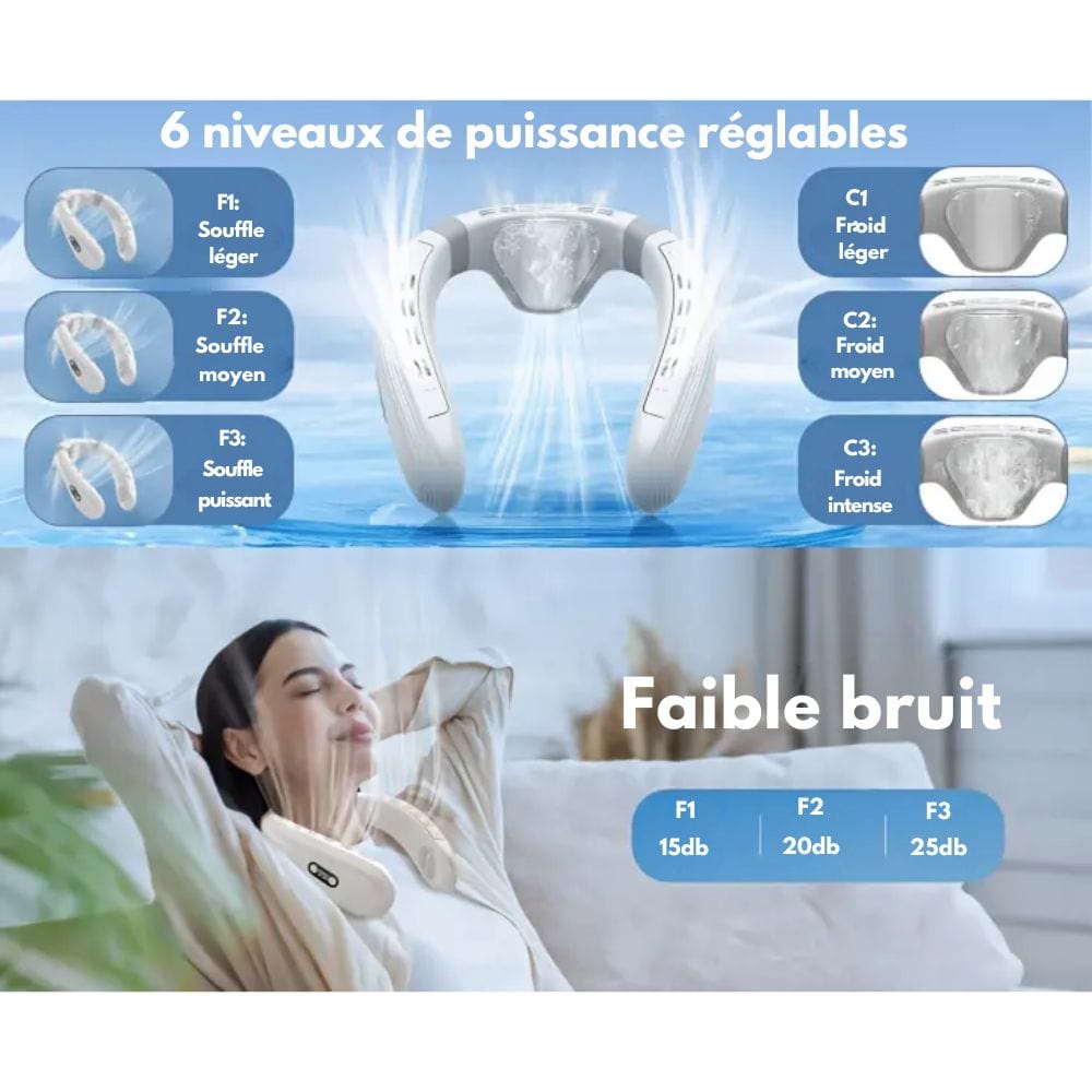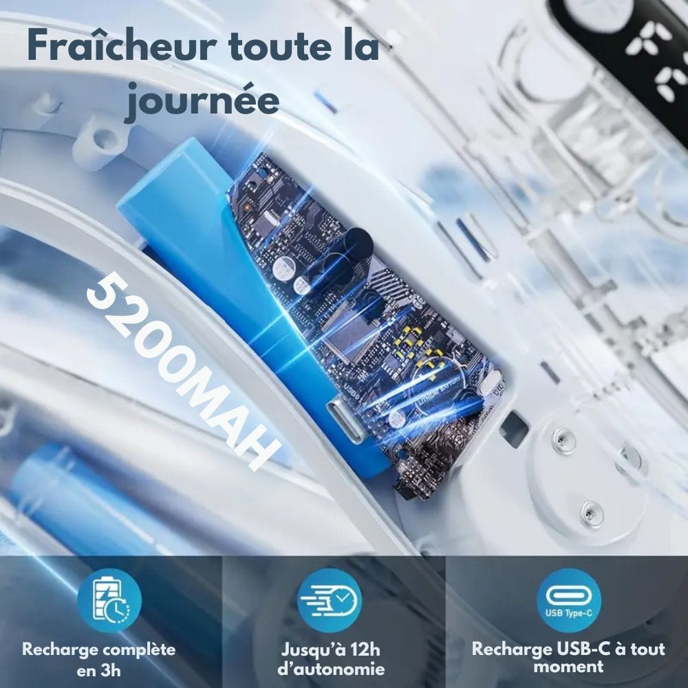 Adattatelo ai vostri desideri! Con 3 velocità di ventilazione e 3 livelli di freddo, potete scegliere la freschezza perfetta per ogni momento. Lo schermo mostra le impostazioni e la batteria dura fino a 12 ore, ricaricabile tramite USB-C ovunque.